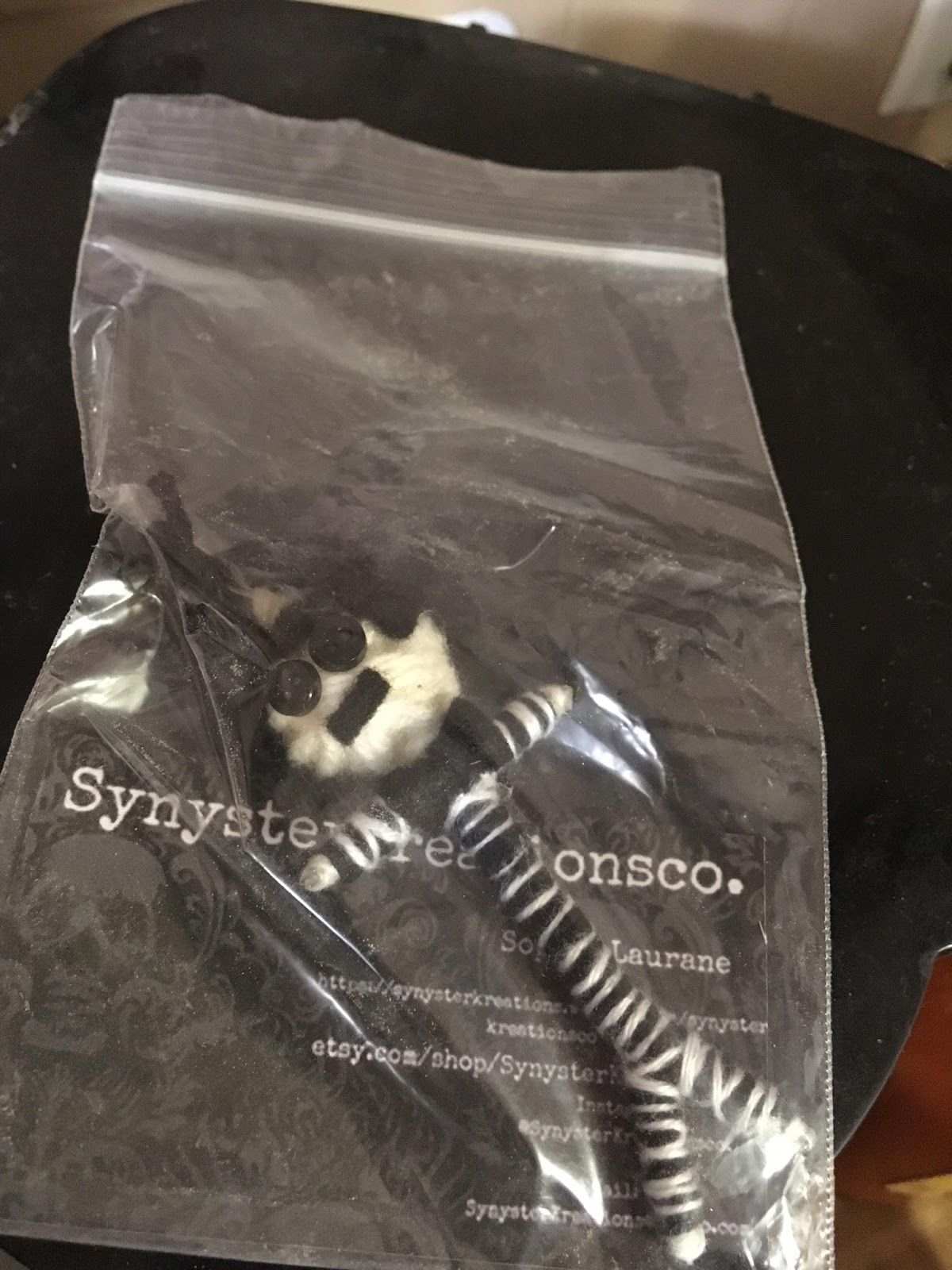 It's a little voodoo doll toy thingy! I'm not sure if this is meant to be a specific character or just a little spoopy guy in general. I have a couple of similar dolls hanging in my car, where he or she will be joining them shortly. This new friend came courtesy of